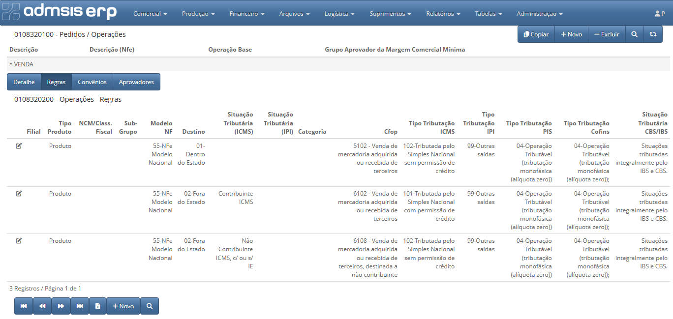 Com o Admsis ERP voce tem o cadastros de operações por filial.